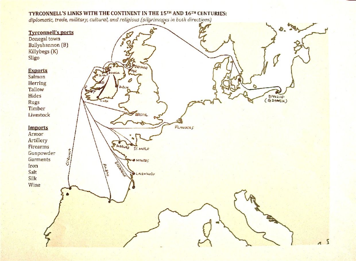 Tyrconnell also received traders in Donegal town from England, Wales and Scotland, and Flanders, France, and Spain. Foreign ships also frequently called at Tyrconnell’s other ports, especially Ballyshannon, Killybegs, and Lough Swilly. It also had its own trading agents in foreign ports. Tyrconnell’s trading links were long established with Bristol, St. Malo, Morlaix, Bordeaux, and beyond to Denmark, Spain, and Italy.